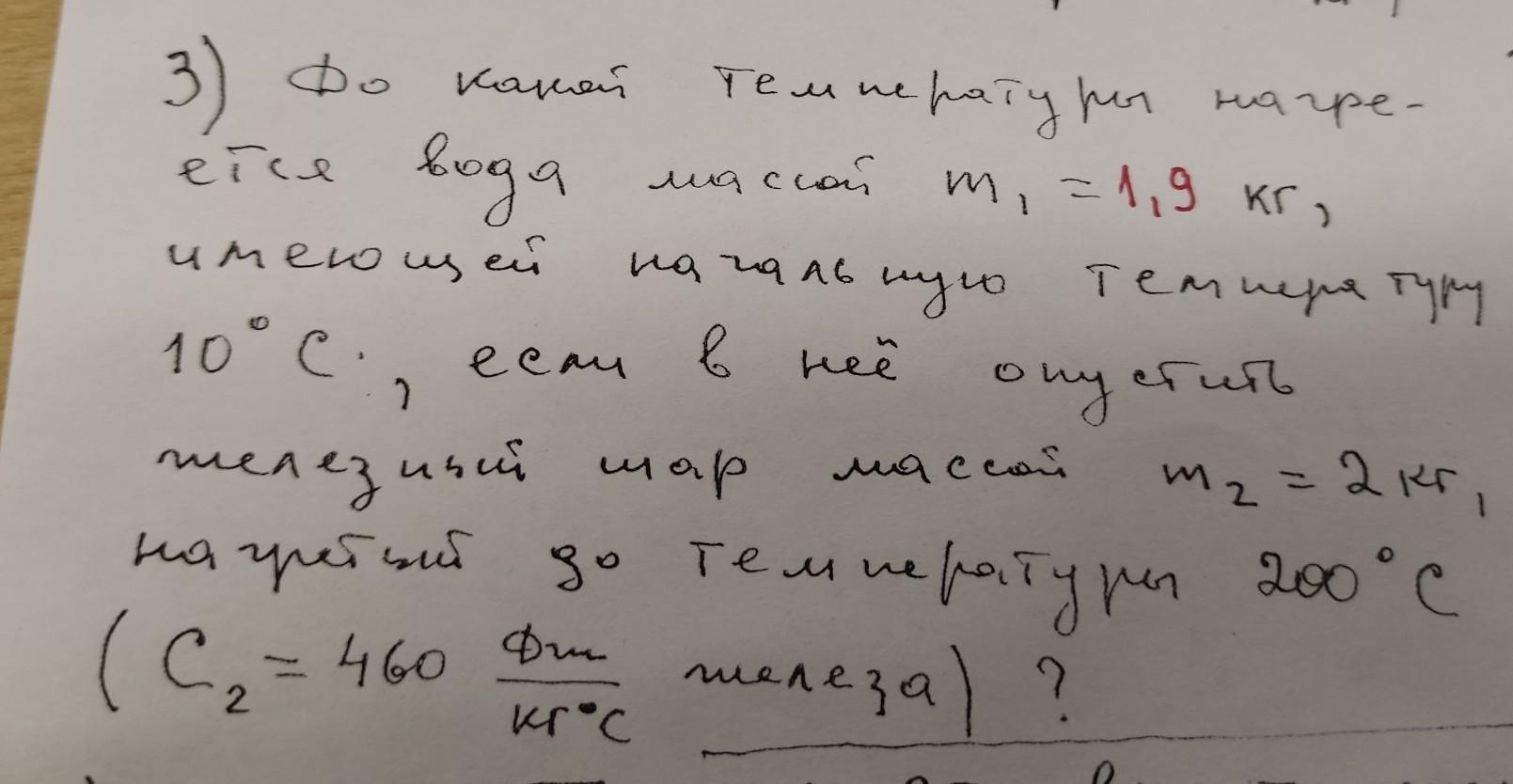 До какой температуры нагревается вода массой 1.9 кг, имеющий начальную температуру 10°, если в не опустить железный шар массой 2кг нагретый до температуры 200°С