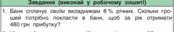 1. Банк сплачує своїм вкладникам 8% річних. Скільки гро- шей потрібно покласти в банк, щоб за рiк отримати 480 грн прибутку?Допоможiть будь ласка