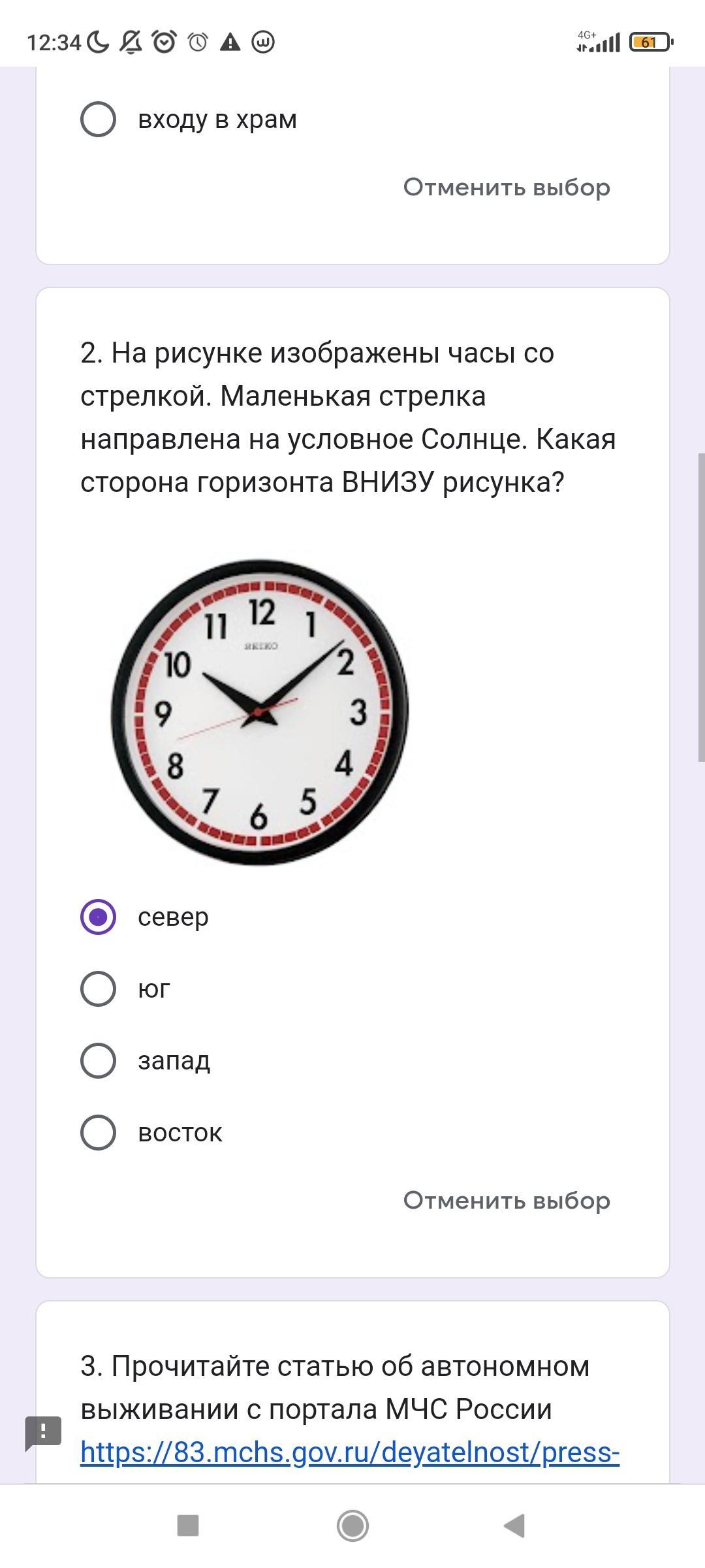 На рисунке изображены часы со стрелкой. Маленькая стрелка направлена на условное Солнце. Какая сторона горизонта ВНИЗУ рисунка