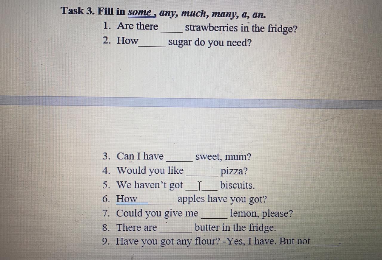 Відповідь:1 some 2much 3any 4some 5 any 6much 7a 8many 9many