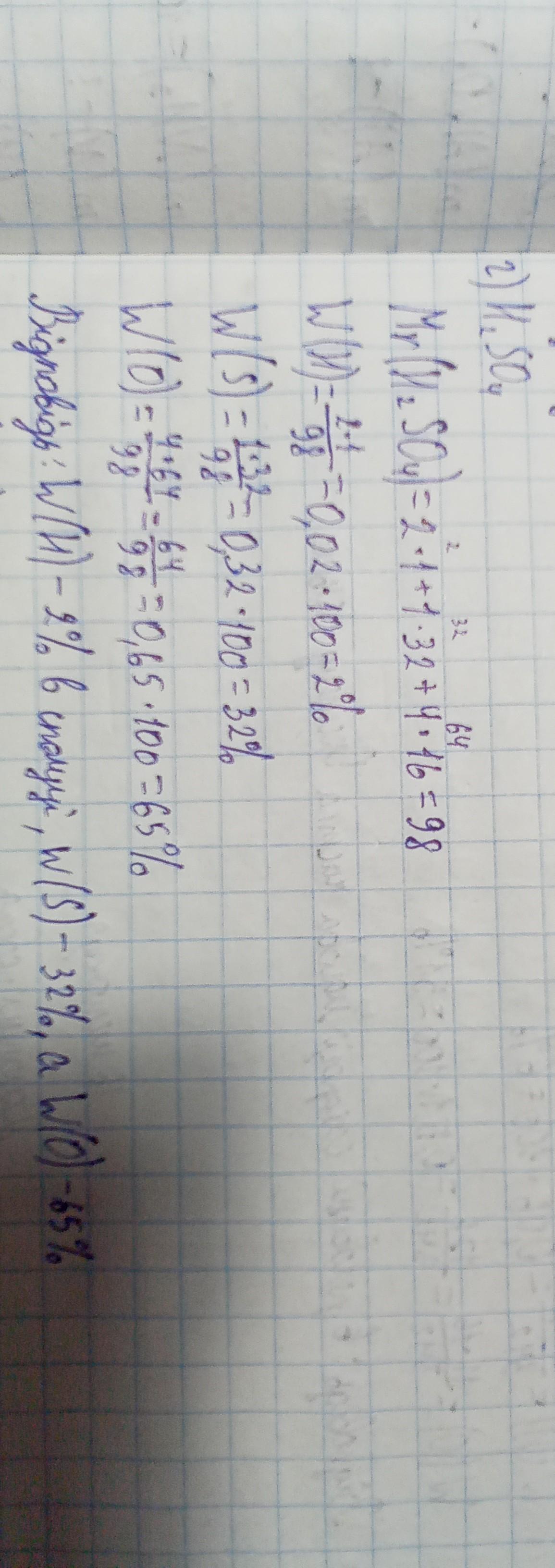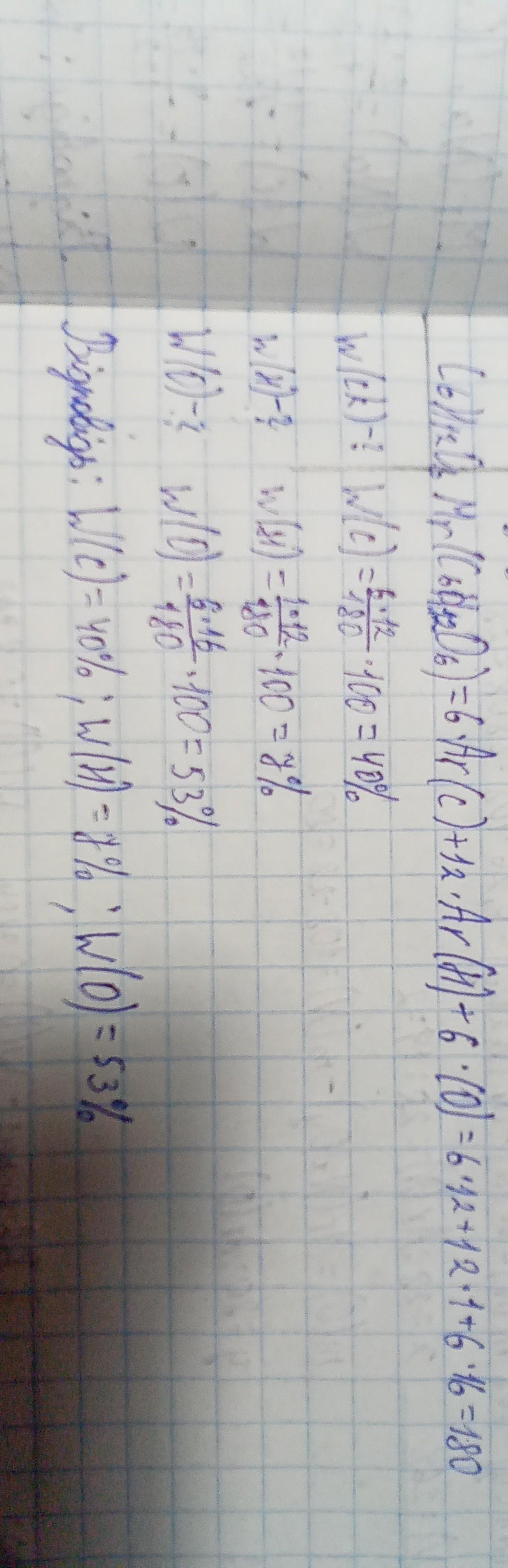 1.Розрахувати масову частку в всіх елементів в речовинах: Н2SО4, C6H12O6 допоможіть будь ласка
