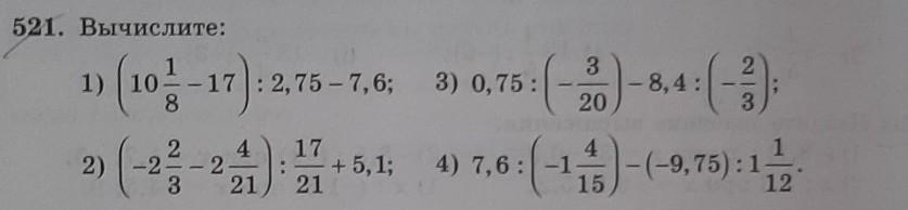 521. Вычислите: 1) (10-17): 2,75-7,6; 3) 0,75: 2) -2 2 21 17 21 3 20 :( - +5,1; 4) 7,6: -1- - 8,4: 1 3 4 5:(-1)-(-9.75): 11/2