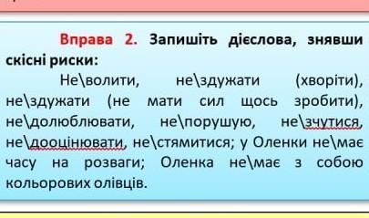 неволити, нездужати, не здужати, не долюблювати, не порушую, не зчутися, недооцінювати, нестямитися, у Олнеки неиає часу на рлзваги, Оленка не має з собою кольорових олівців
