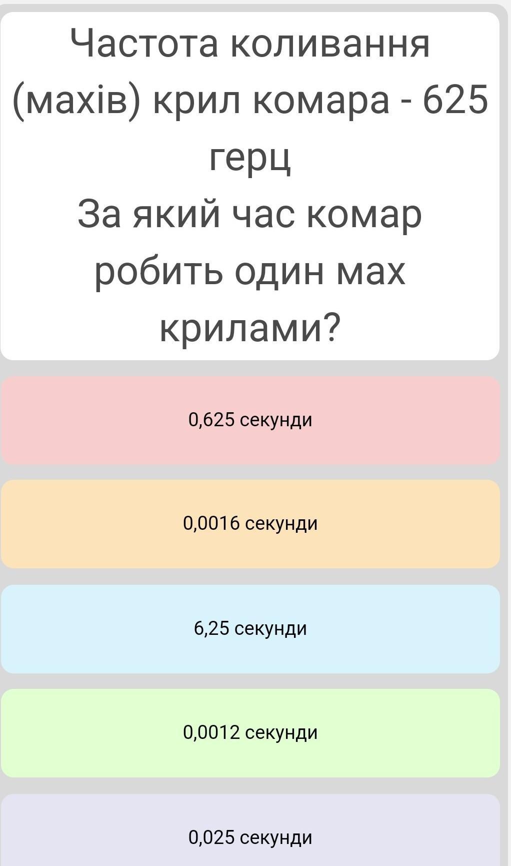 Частота коливання (махів) крил комара - 625 герц За який час комар робить один мах крилами?