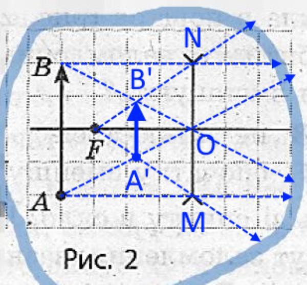 Пересечение прямых AO и FM даст первую точку изображения A'. Аналогично строим вторую точку изображения B'. Получаем изображение A'B'.