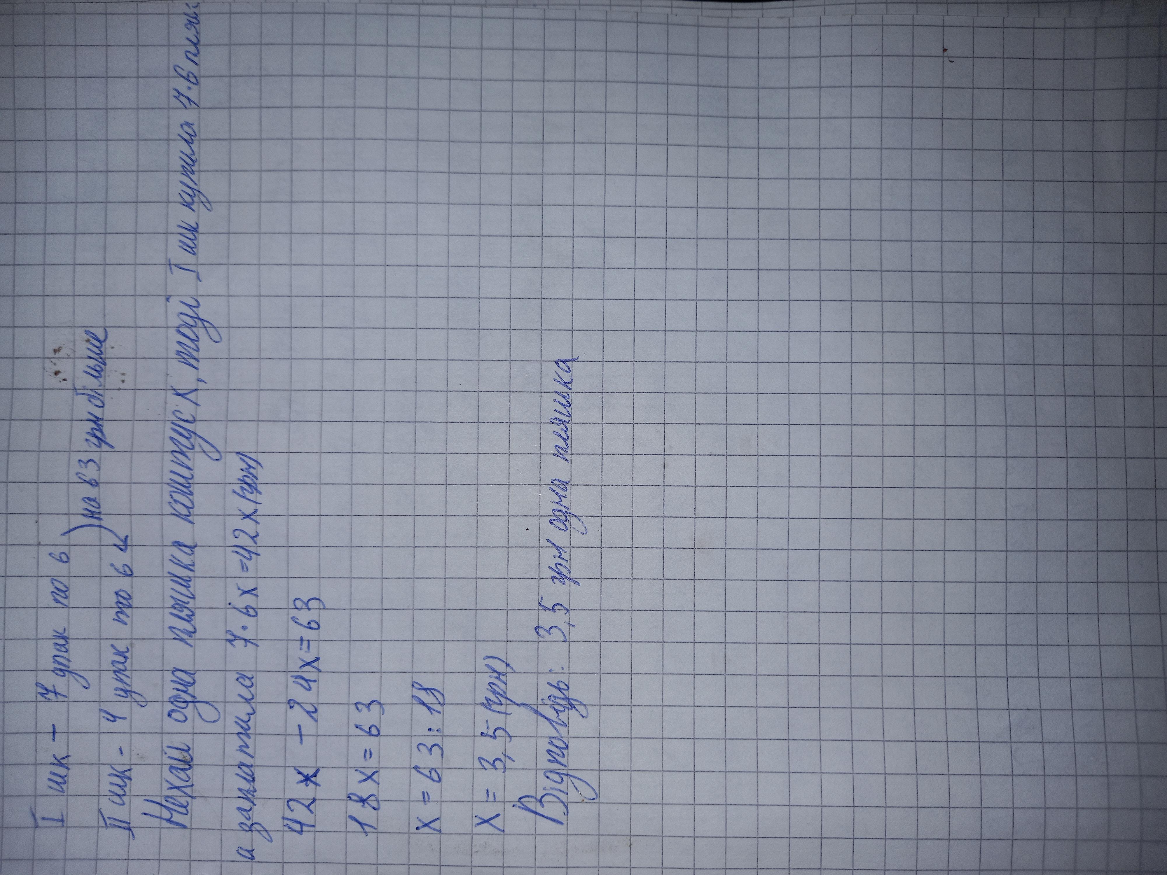 Одна школа купила 7 упаковок води по 6 пляшок в упаковці а інша 4 такі упаковки. При цьому перша школа заплатила на 63 гривні більше ніж друга. Скільки коштує одна пляшка води?