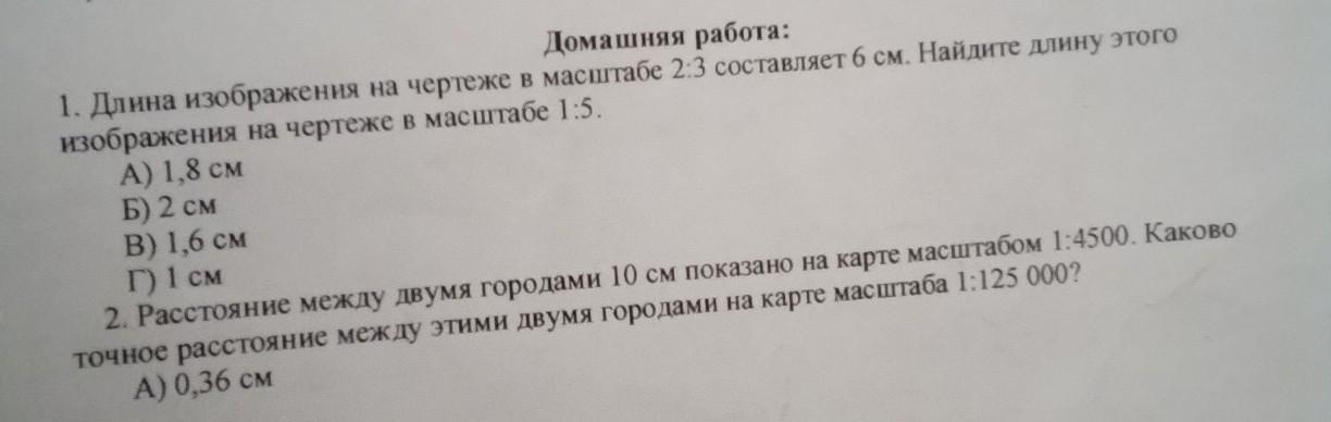 1. Длина изображения на чертеже в масштабе 2:3 составляет 6 см. Найдите длину этого изображения на чертеже в масштабе 1:5. A) 1,8 см Б) 2 см B) 1,6 см Г) 1 см 2. Расстояние между двумя городами 10 см показано на карте масштабом 1:4500. Каково точное расстояние между этими двумя городами на карте масштаба 1:125 000? A) 0,36 см