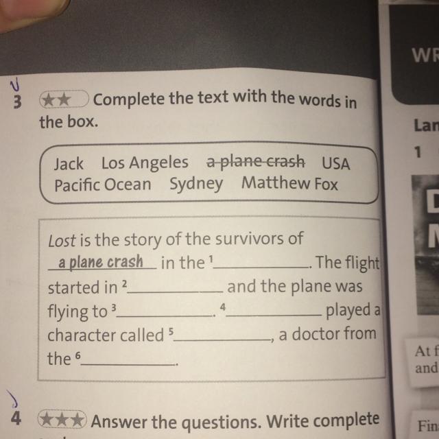 3* Complete the text with the words in the box. Jack Los Angeles a plane crash USA Pacific Ocean Sydney Matthew Fox Lost is the story of the survivors of a plane crash in the¹______________ started in 2 flying to 3 character called 5 the 6 The flight and the plane was - played a a doctor from