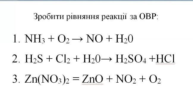 Зробити рівняння реакції за ОВР: 1. NH3 + O2 → NO + H20 2. H2S + Cl2 + H20→ H2SO4+HCl 3. Zn(NO3)2 = ZnO + NO2 + O2 -