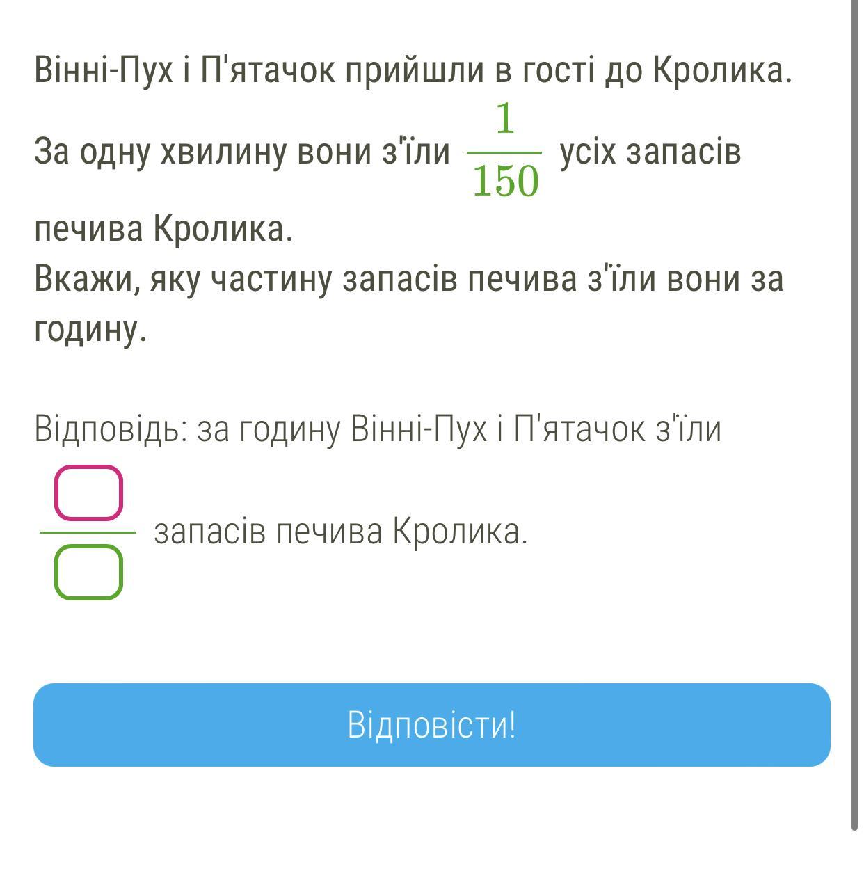 в одній годині - 60 хв. отже за годину вони з'їдять у 60 разів більше, ніж за хвилину, а саме 60/150=2/5 запасів