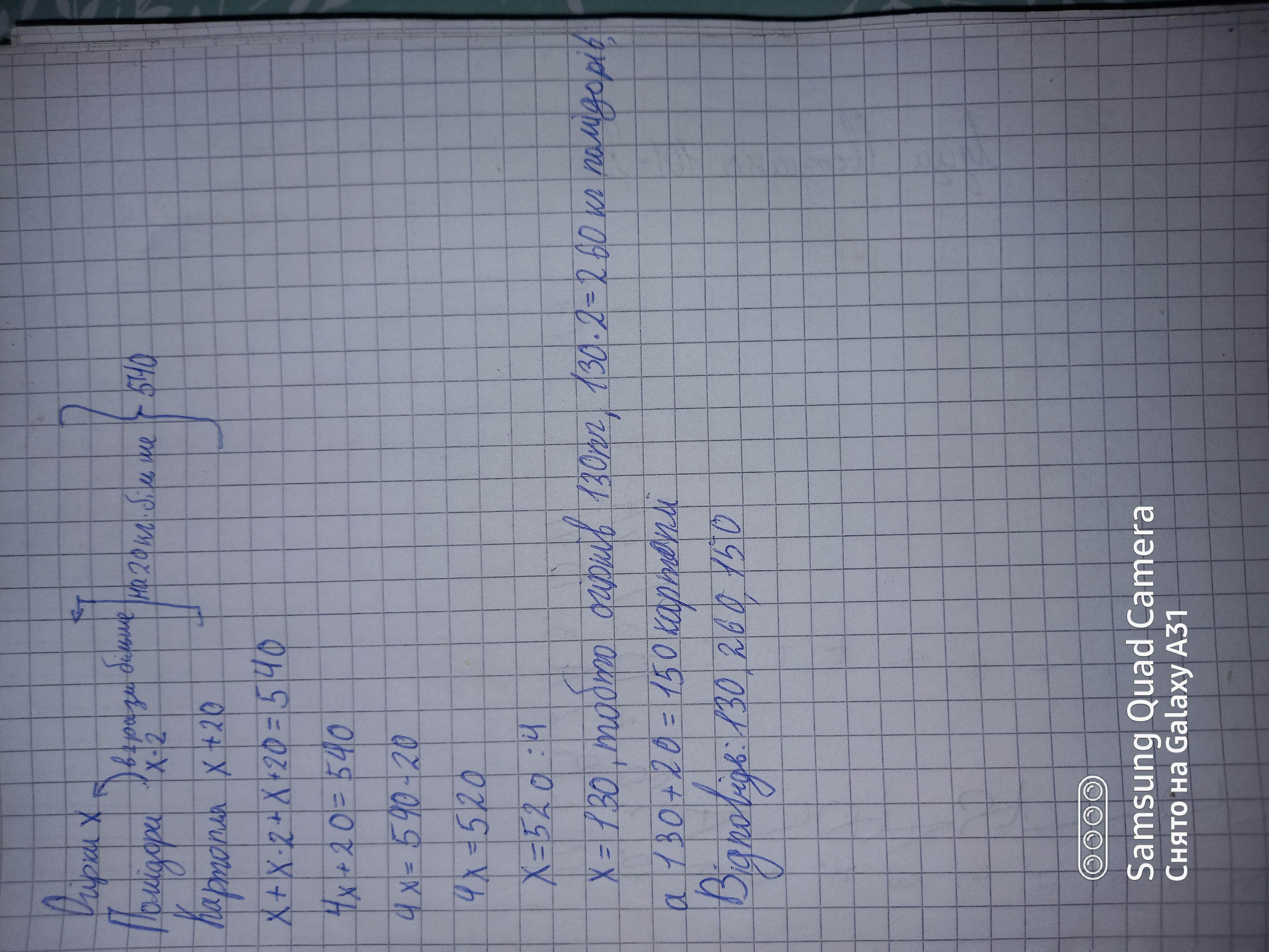 У магазин привезли 540 кг огірків, помідорів і картоплі, при чому помідорів було вдвічі більше, ніж огірків, а картоплі на 20 кг більше, ніж огірків . Скільки кілограмів овочів кожного виду привезли в магазин?прошу срочно контроша дай 11 балов