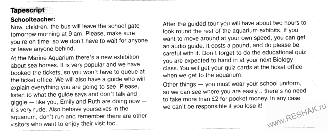 После экскурсии с гидом у вас будет два часа на осмотр остальных аквариумных выставок. Если вы хотите двигаться с вашей собственной скоростью, вы можете получить аудио гида. Это стоит фунт и пожалуйста обращайтесь бережно с ним. Не забудьте выполнить викторину, которую ожидается в вашем следующем классе по биологии. Вы получите карточки викторины в кассе, когда мы пойдем в аквариум.