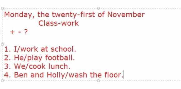 Monday, the twenty-first of November Class-work +- ? 1. I/work at school. 2. He/play football. 3. We/cook lunch. 4. Ben and Holly/wash the floor.пппппжжжжжжжж ссррроооччнннооооооооо очень важно для меня!!!!!!!!!!!!!!!!!!!!!!!!даю 50 баллов