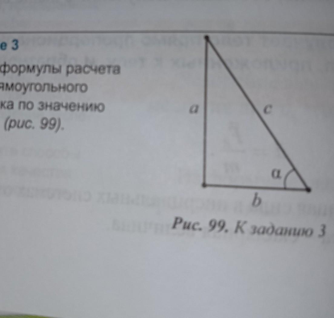 Задание 3 Запишите формулы расчета катетов прямоугольного треугольника по значению гипотенузы (рис. 99).