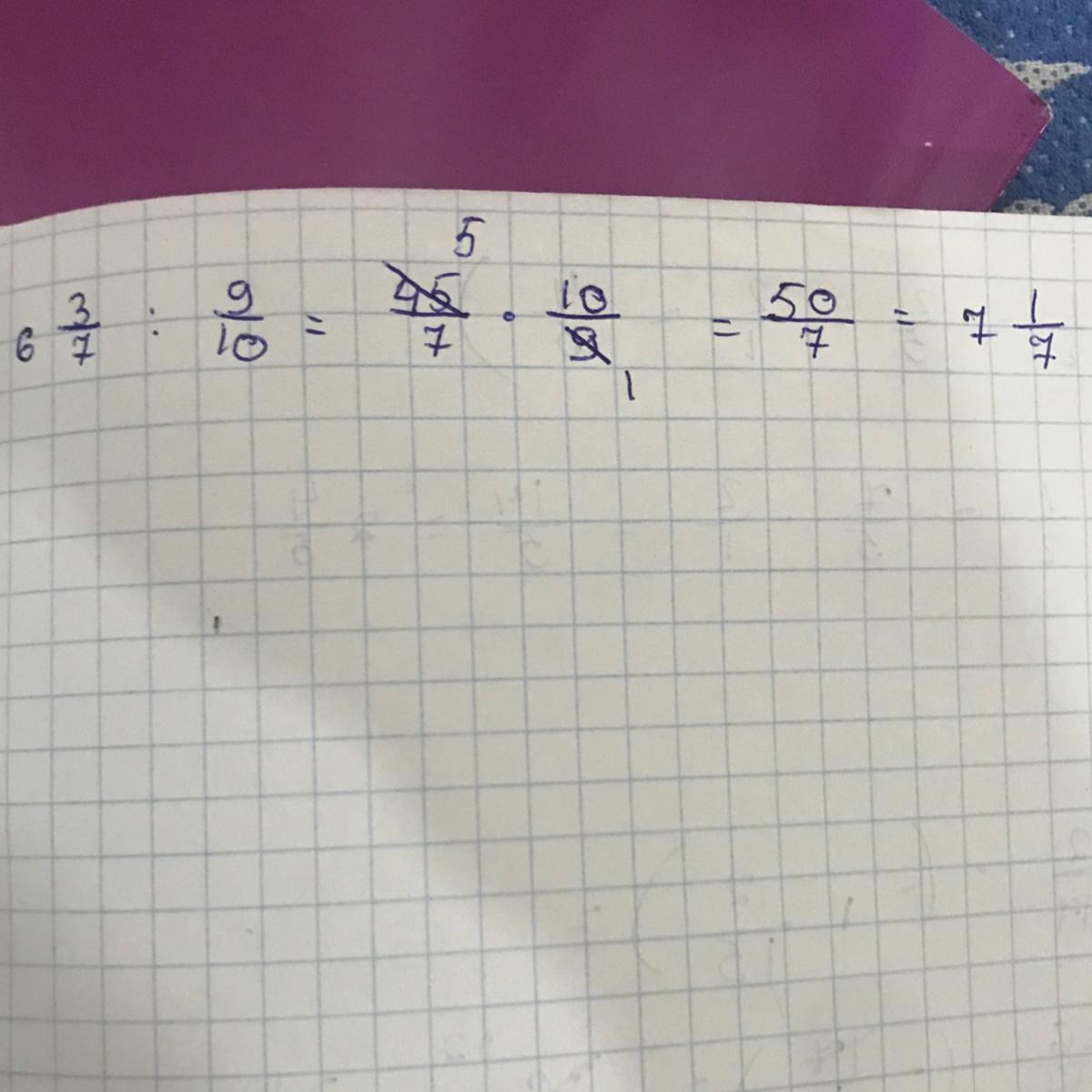 Выполни деление смешанного числа и обыкновенной дроби постепенно. Результат сократи, выдели целое! 6 3/7 : 9/10 = ?/7 × ?/? = ? ?/?