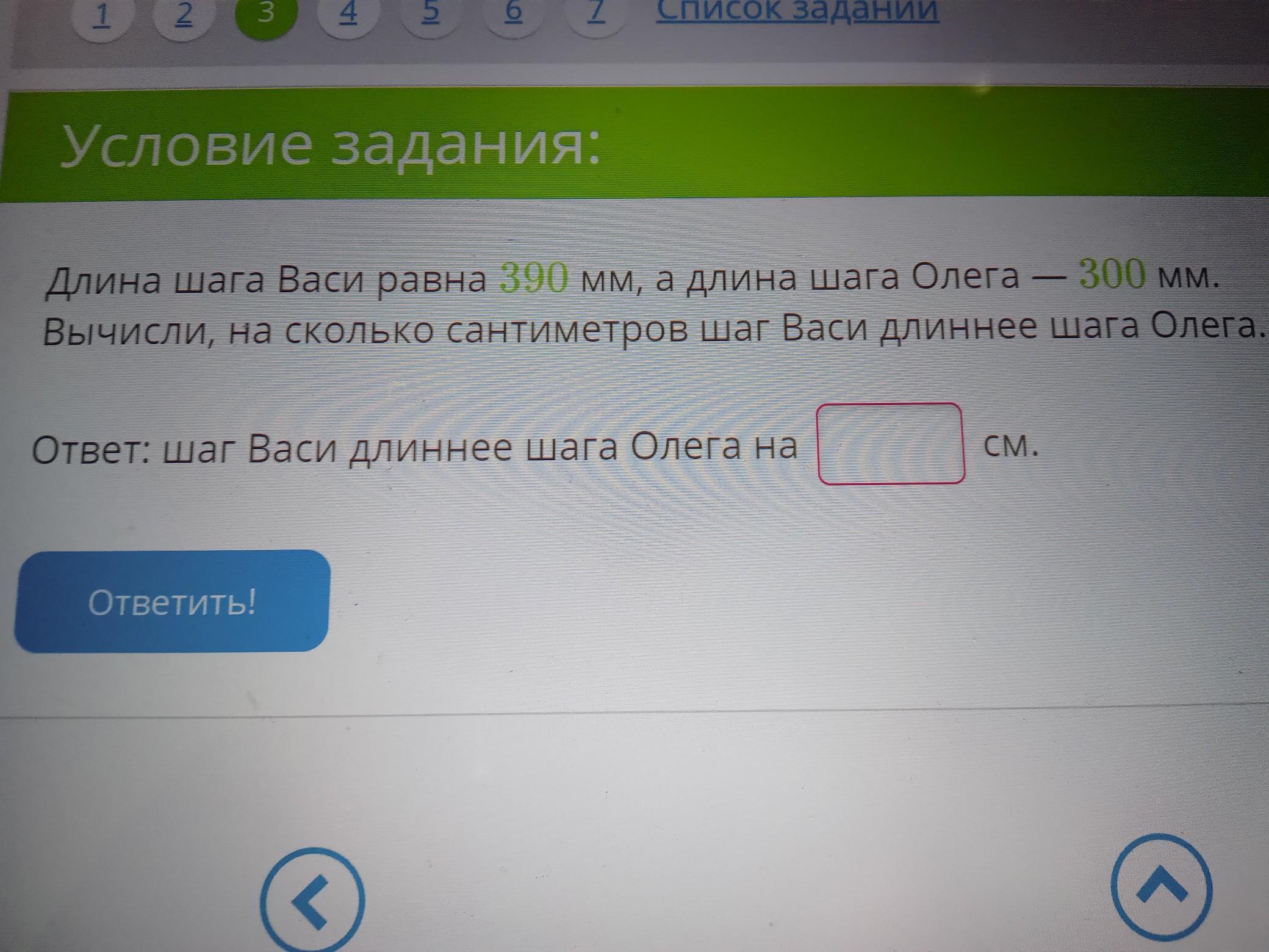 - Длина шага Васи равна 390 мм, а длина шага Олега - 300 мм. Вычисли, на сколько сантиметров шаг Васи длиннее шага Олега. Ответ: шаг Васи длиннее шага Олега на Ответить! CM.