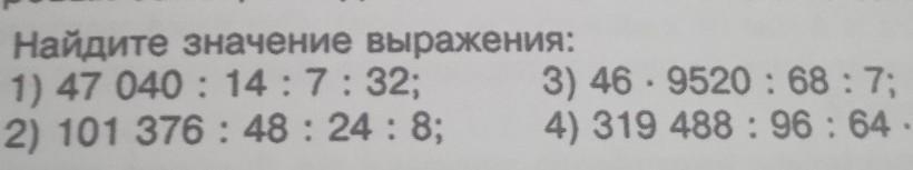 608. Найдите значение выражения: 1) 47 040: 14:7:32; 2) 101 376 : 48: 24:8; 3) 46-9520: 68:7; 4) 319 488:96: 64-23.