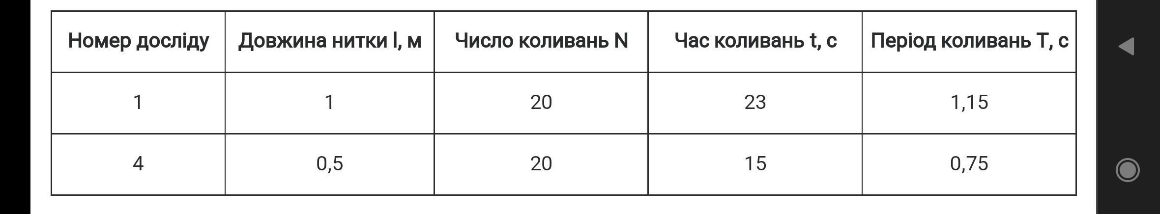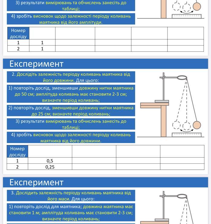 2) повторіть дослід, зменшивши довжину нитки маятника