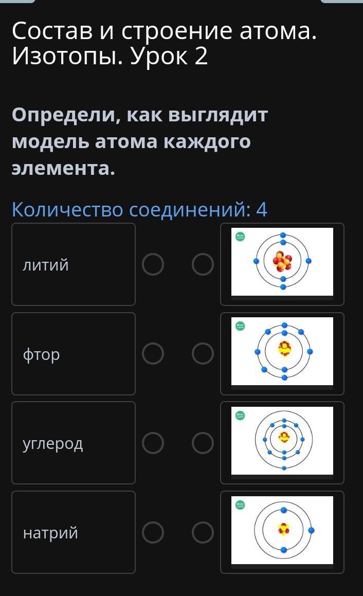 Состав и строение атома. Изотопы. Урок 2 Определи, как выглядит модель атома каждого элемента. Количество соединений: 4 ЛИТИЙ фтор углерод натрий