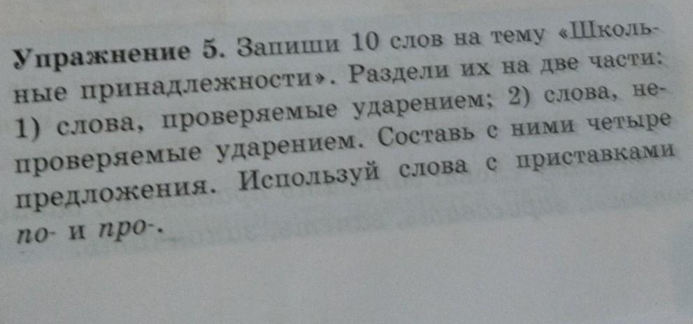 Упражнение 5. Запиши 10 слов на тему «Школь- ные принадлежности». Раздели их на две части: 1) слова, проверяемые ударением; 2) слова, не- проверяемые ударением. Составь с ними четыре предложения. Используй слова с приставками по- и про-.