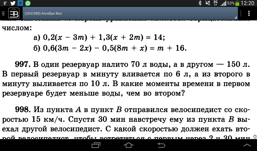 Помогите пожалуйста решить задачу по алгебре 8 класс. буду очень благодарна:) В один резервуар налито 70л воды, а в другой 150л. в первый резервуар в минуту вдивается по 6л., а из второго в минуту выливается по 10л. в какие моменты времени в первом резервуаре будет меньше воды, чнм во втором? Спасибо