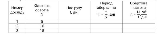 2. Виміряйте час , за який здійснюється, наприклад, 5-15 обертів Місяцем навколо Землі. Дослід повторіть три рази. Щоб розпочати дослід натисніть кнопку . Щоб зупинити дослід натисніть кнопку . Час обертання Місяця навколо Землі дивимося на . Щоб очистити дані досліду натисніть кнопку .