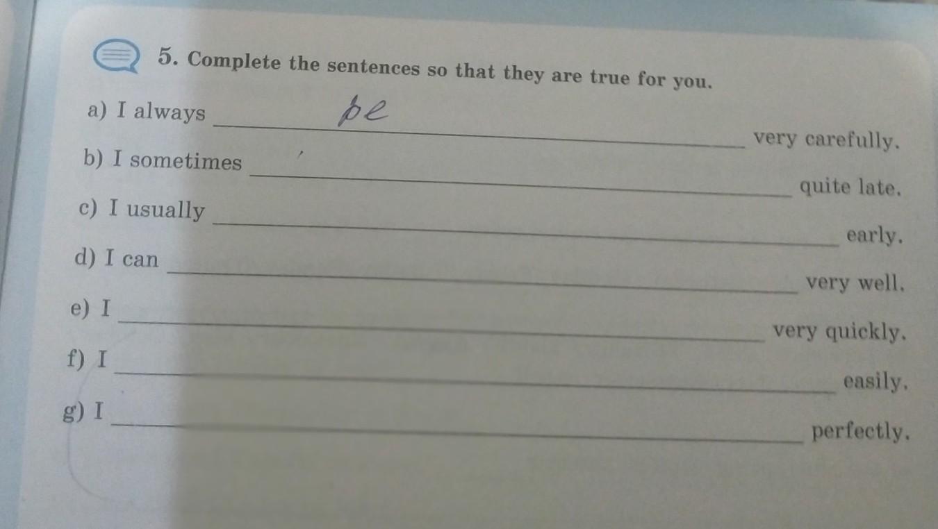 a) I always b) I sometimes c) I usually d) I can e) I f) I 5. Complete the sentences so that they are true for you. g) I very carefully. quite late. early. very well. very quickly. easily. perfectly. пожалуйста помогите