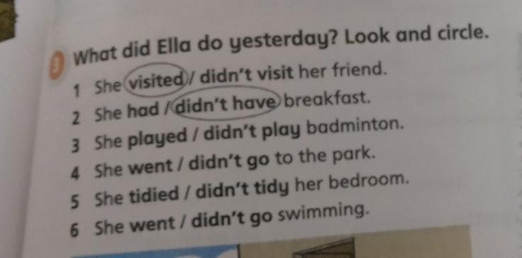 What did Ella do yesterday? Look and circle. 1 She visited\didn't visit her friend. 2 She had /didn't have breakfast.3 She played / didn't play badminton.4 She went / didn't go to the park. 5 She tidied / didn't tidy her bedroom. 6 She went / didn't go swimming.