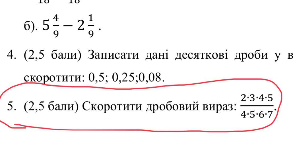 5 в чисельнику скоротиться з 5 в знаменнику і 4 теж скоротиться. отже вийде 2•3/6•7; два помножиться на 3 це буде 6, отже 6/6•7 дві шістірки скоротяться і вийде 1/7