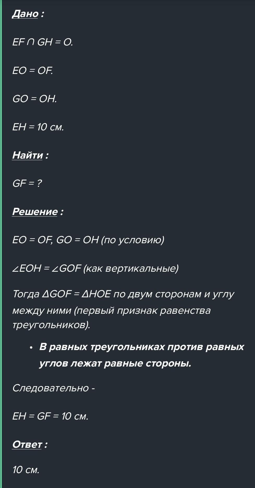 9. EF және GH кесінділері қиылысу нүктесінде қақ бөлінеді. Егер EH = 10 см болса, онда GF кесіндісінің ұзындығын тап. А) 5 см. В) 10 см. C) 15 см. D) 20 см. Пж дайте ответ дам 50 баловв