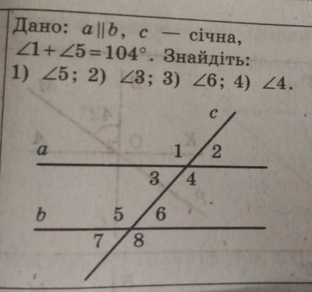 Дано: a||b, с- січна, уг.1 + уг.5 = 140°. Знайдіть: 1) уг.5; 2) уг.3; 3) уг.6; 4) уг.4.