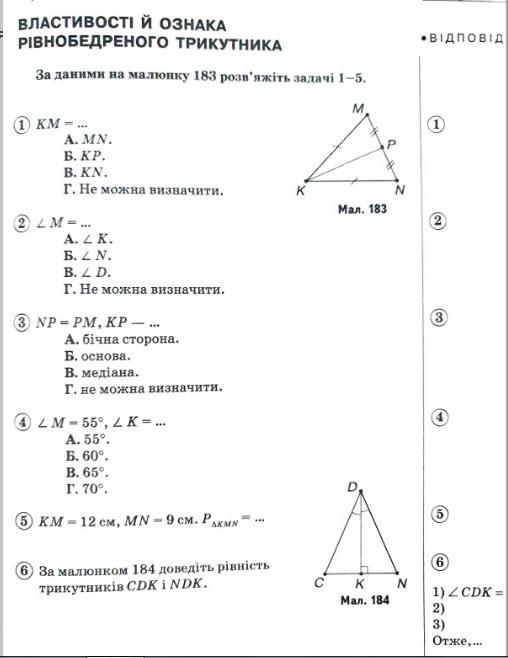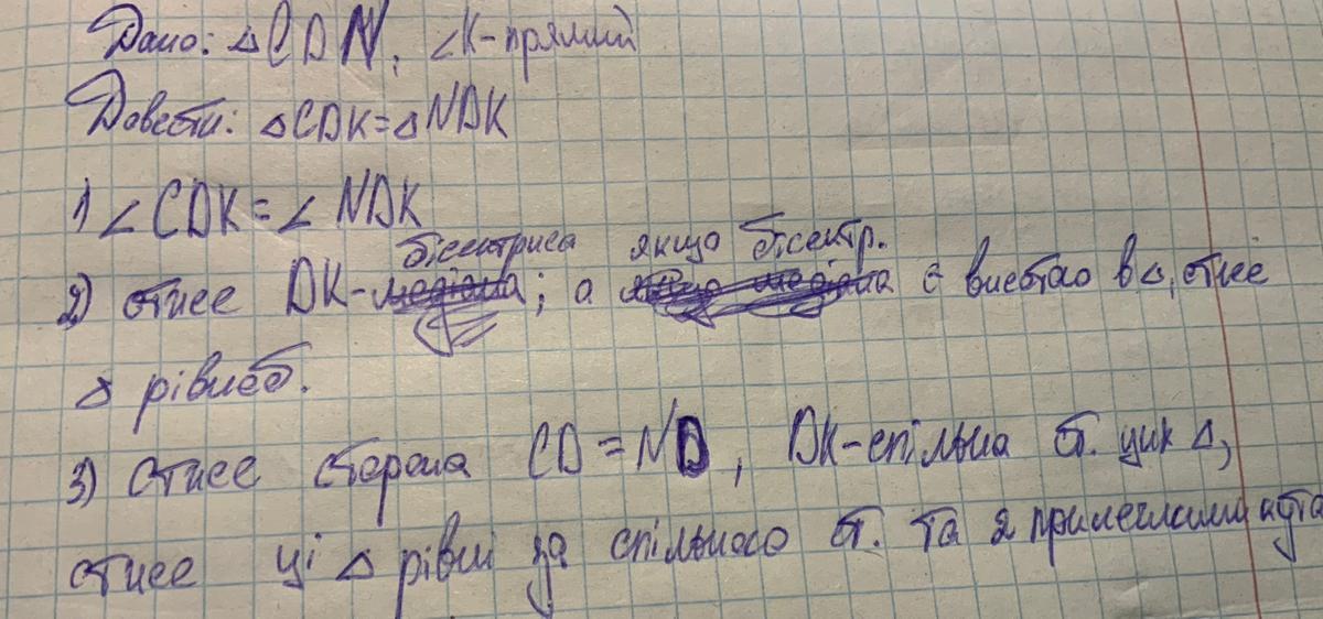 Отже, за другою ознакою рівності трикутників, в якій йдеться про сторону та прилеглі кути (в нашому випадку — кути CDK, KDN; спільна сторона DK та кут К), трикутники є рівними.
