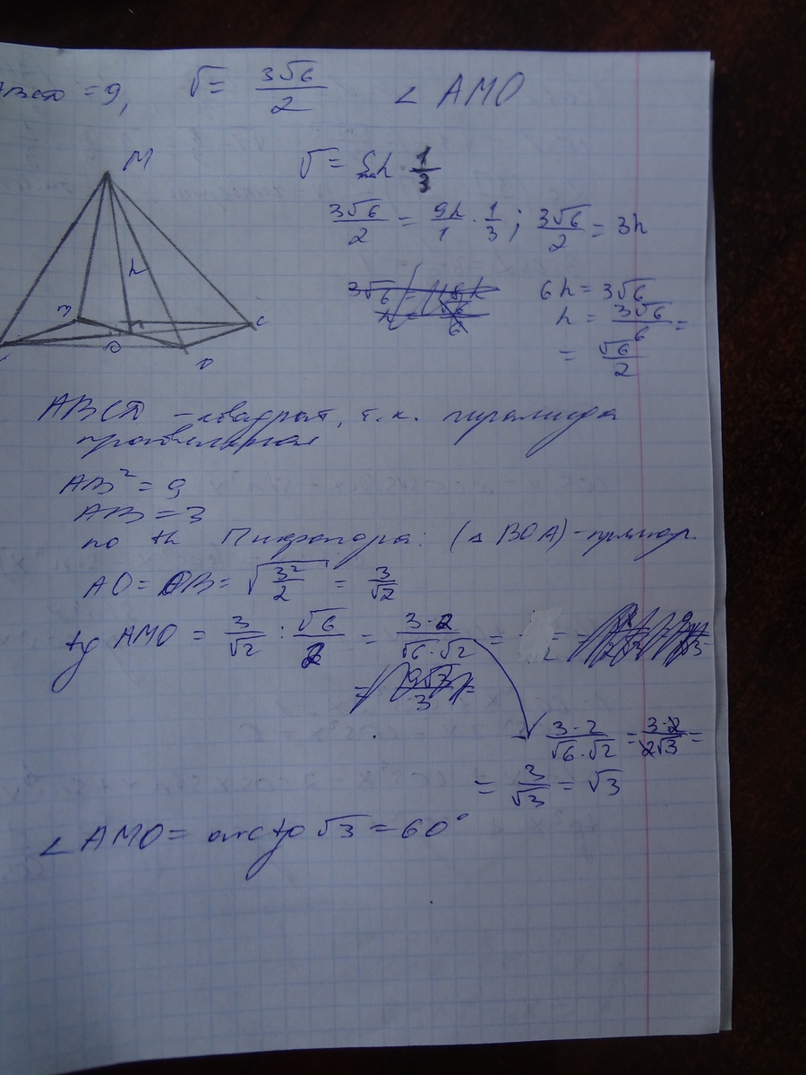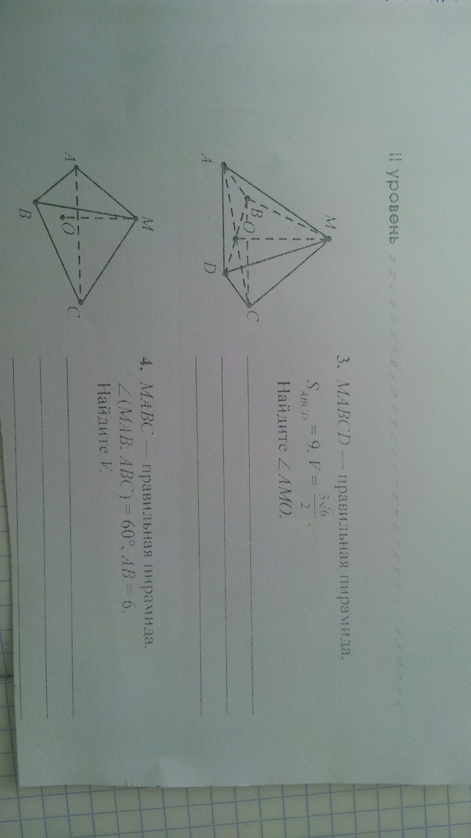 Во второй задаче найди площадь основания, 1/2АВ*АВsin60, (60 градусов, потому что треугольник правильный в правильной пирамиде), угол между плоскостями будет углом между апофемой на грани МАВ и высотой к стороне АВ) , через них можно найти высоту пирамиды, формула объема та же, что и в первой задаче:)