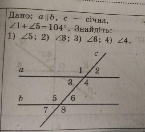 1) Кут 1 та кут 5 відповідні, тобто рівні, отже кут 5=кут 1=104:2=52. відповідь 52