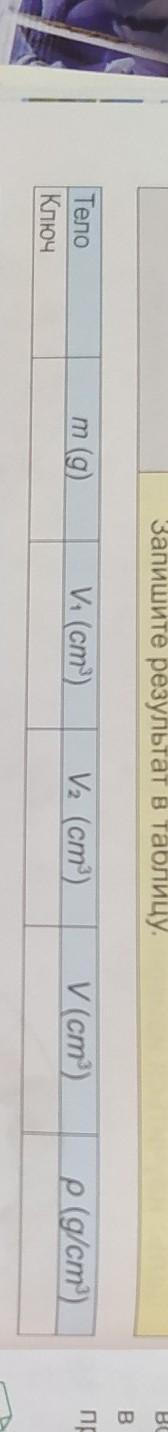 Порядок выполнения работы 1-й опыт 1. Начертите таблицу, представленную ниже, в своей тетради. 2. Взвесьте массу ключа на весах и запишите результат в таблицу. 3. Налейте воду в мензурку. Определите объём воды в мензурке (V,) и запишите результат в таблицу. 4. Привяжите металлический ключ к нити, опустите его полностью в воду и измерьте уровень воды (V.). За- пишите результат в таблицу. 5. Рассчитайте изменение объёма воды по формуле V=V, – V,. 6. Определите плотность ключа по формуле. 7. Определите, из какого вещества изготовлен ключ, исходя из таблицы на стр. 30.