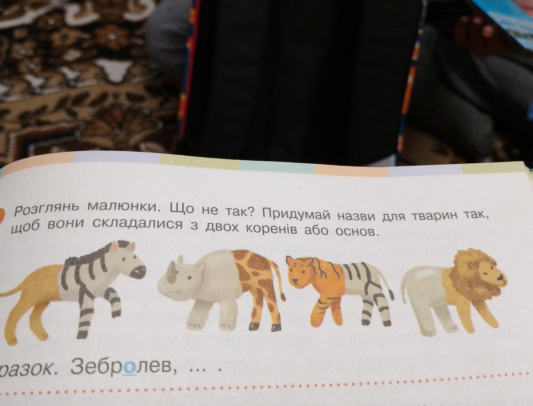 Розглянь малюнки. Що не так? Придумаи нави для тварин так щоб вони складалися з двох орон або основ И CLE Зразок. Зебролев,