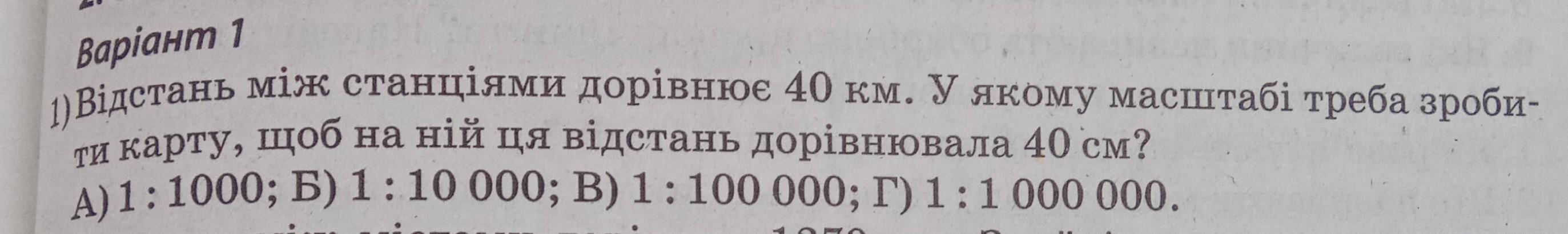 1) Відстань між станціями дорівнює 40 км. У якому маштабі треба зробити карту, щоб на ній ця відстань дорівнювала 40 см? A) 1:1000; Б) 1:10 000; B) 1: 100 000; Г) 1:1 000 000.