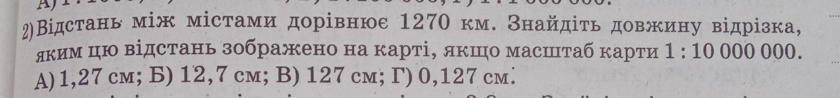 2) Відстань між містами дорівнює 1270 км. Знайдіть довжина, яким цю відстань зображено на карті, якщо масштаб карти 1:10 000 000. А) 1,27 см; Б) 12,7 см; В) 127 см; г) 0,127 см.