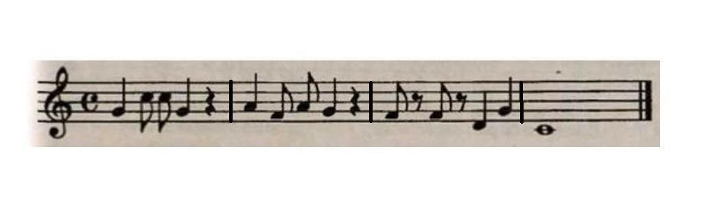 розмір 2\4, 1 такт соль до,до,соль 2 такт ля фа ля фа соль 3 такт фа фя ре соль 4 такт до