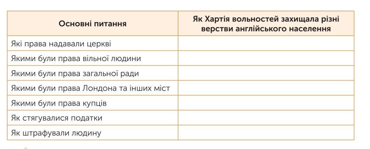 Які права надавали церкві?:Церква мала право бути вільною і повною мірою недоторканою, володіти своїми правами і свободами.Якими були права вільної людини?:Жодна вільна людина не буде заарештована, позбавлена майна, ув'язнена, оголошена поза законом, відправлена у вигнання інакше, ніж за законами держави.Якими були права Лондона та інших міст?:Лондон та всі інші міста мали право мати свої свободи і звичаї.Якими були права купців?:Усі купці мали право вільно й безпечно виїздити з Англії та в'їздити до неї, перебувати та їздити Англією, як суходолом так і водою, для того, щоб купувати продавати.Як стягували податки?:Ані щитові гроші, ані податки не стягували інакше, ніж за загальною радою.Як штрафували людину?:Вільна людина не була оштрафована за дрібний проступок відповідно до виду цього проступку.Про права загальної ради я не знала.