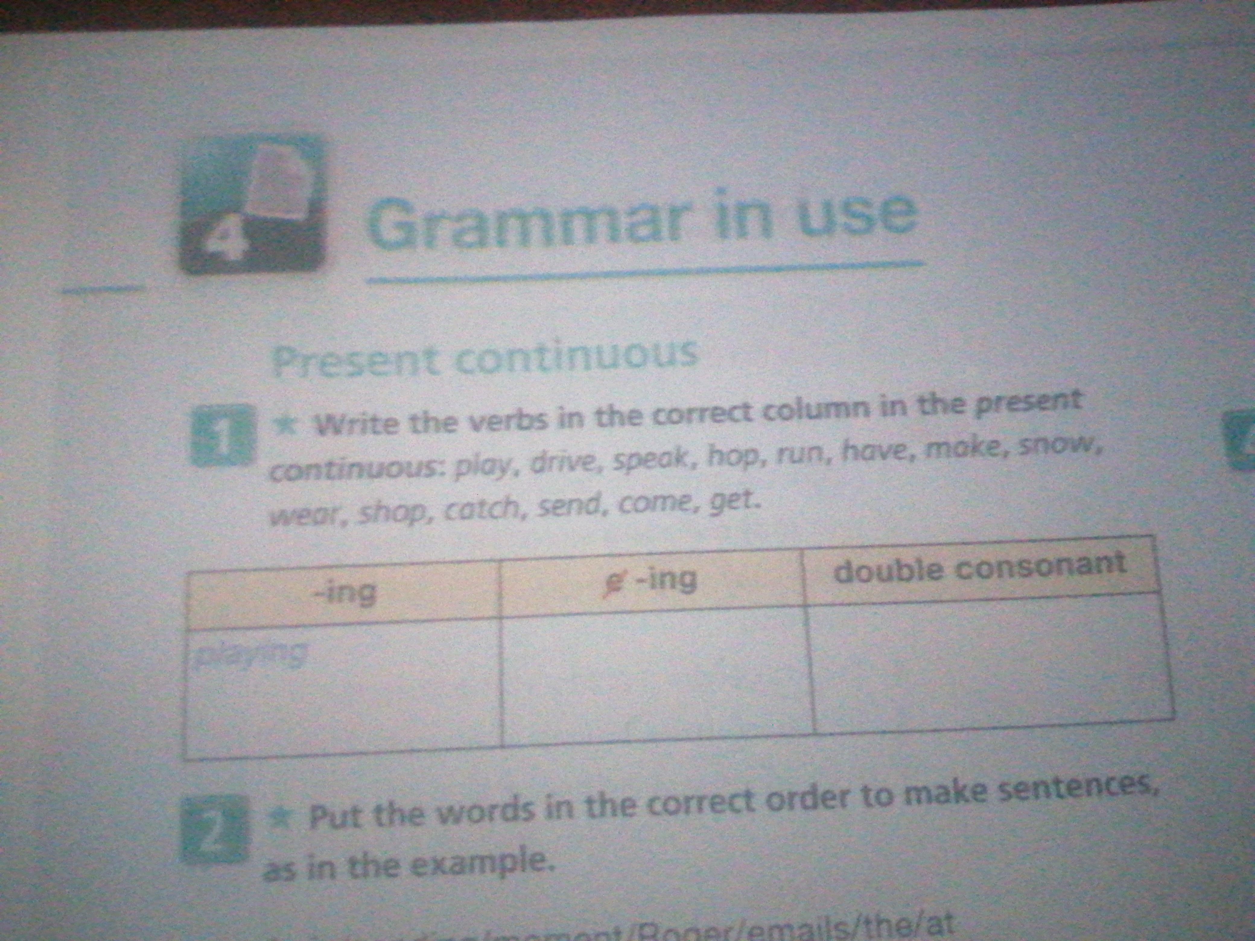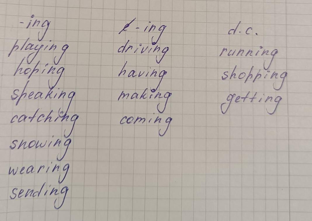 Write the verbs in the correct column in the present continuous: play, drive, speak, hop, run, have, make, snow, wear, shop, catch, send, come, get.