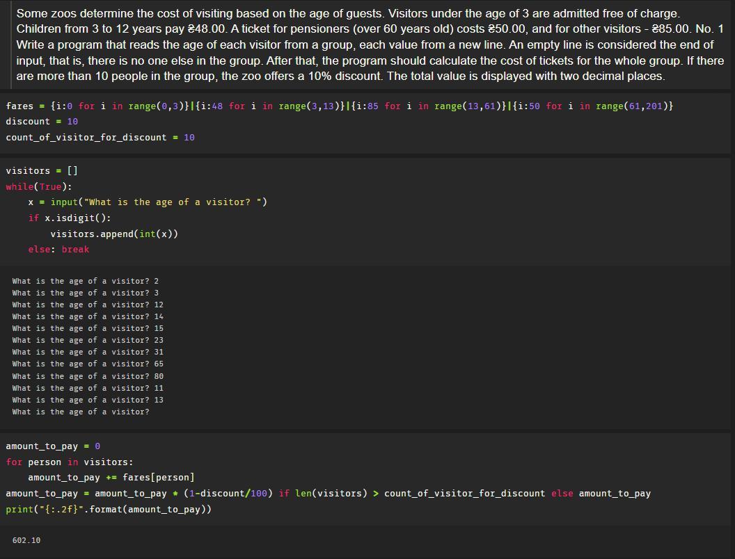В третьем блоке делаем расчёты. Идём по листу и суммируем стоимости билета для каждого. Стоимость берём из словаря. Далее, если в листе больше элементов чем в условии для получения скидки, то считаем скидку на результирующую сумму.