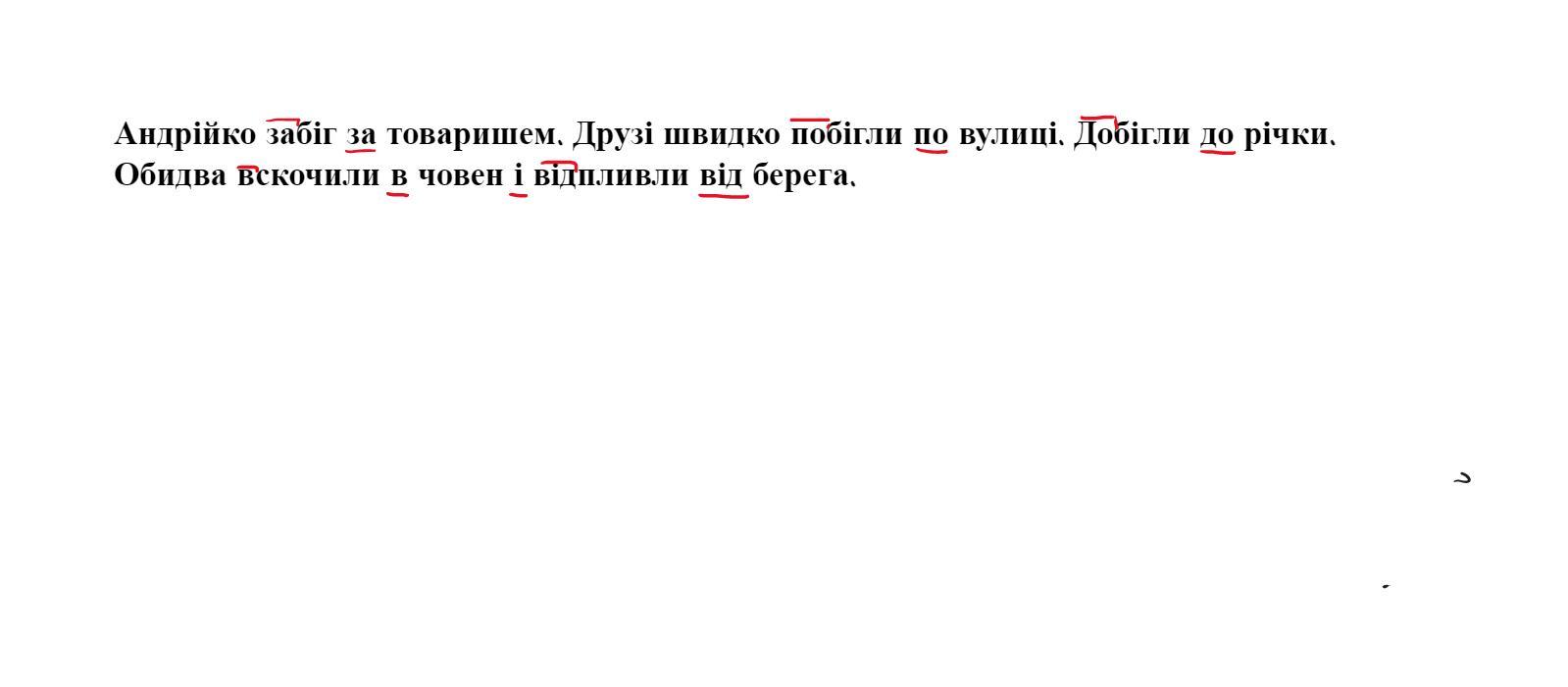 Андрійко (за) біг (за) товаришем. Друзі швидко (по) бігли (по) вулиці. (До) бігли (до) річки. Обидва (в) скочили (в) човен і (від) пливли (від) берега.