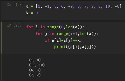 PYTHON есть список a = [1, -1, 5, 6, -9, 8, 7, 2, 3, 10, -6] k = 9 Вывести все пары цифр, которые в сумме дают k