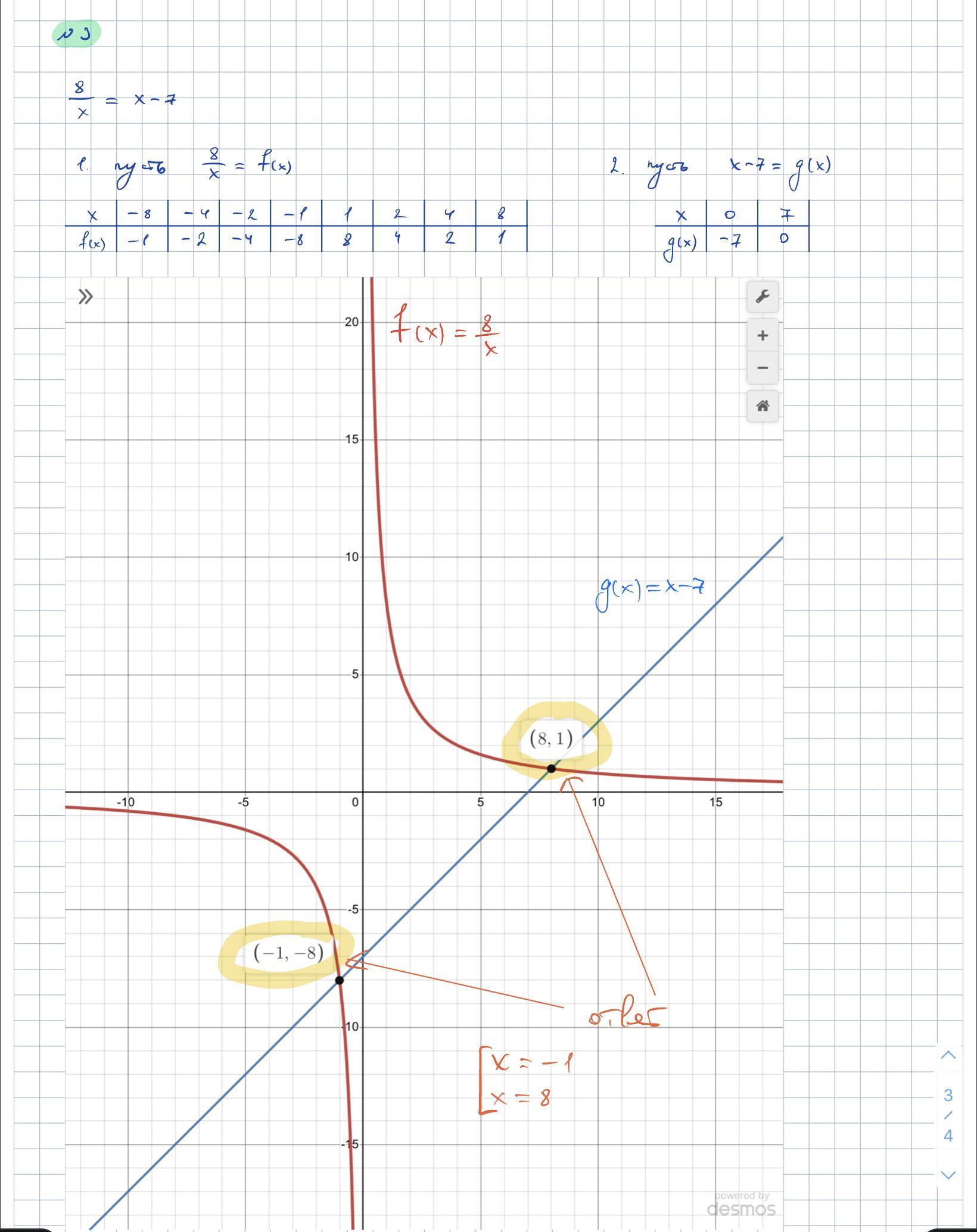 PS Первый график(8/x) называется гипербола - это степенная функция, а второй график(x-7) называется прямая - это линейная функция