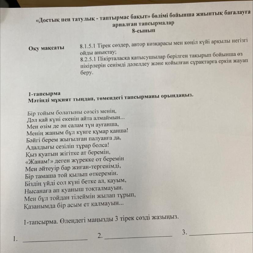 1-тапсырма. Өлеңдегi манызды 3 тірек сөздi жазыныз.