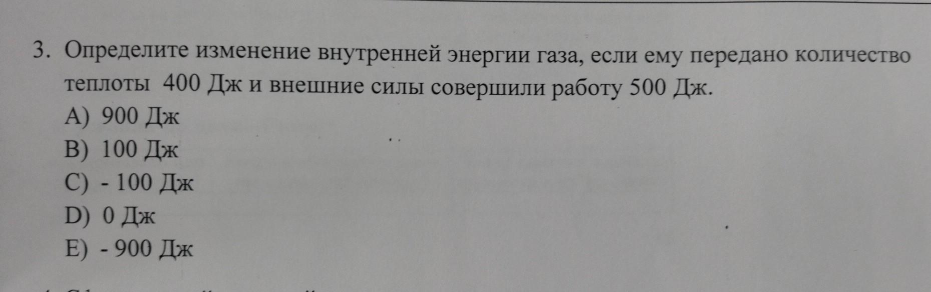 3. Определите изменение внутренней энергии газа, если ему передано количество теплоты 400 Дж и внешние силы совершили работу 500 Дж. A) 900 Дж B) 100 Дж С) - 100 Дж D) 0 Дж E) - 900 Дж