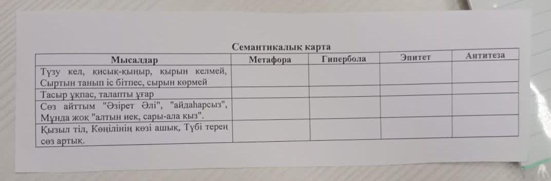 Мысалдар Тузу кел, кисык-кыныр, кырын келмей, Сыртын танып іс бітпес, сырын көрмей Тасыр укпас, талапты угар Сөз айттым "Әзірет Әлі", "айдаһарсыз", Мунда жок "алтын иек, сары-ала кыз". Кызыл тiл, Кенiлiнiң көзі ашык, Түбі терен сөз артык. Семантикалык карта Метафора Гипербола Эпитет Антитезапжж ДАМ 30 БАЛЛОВ!!!