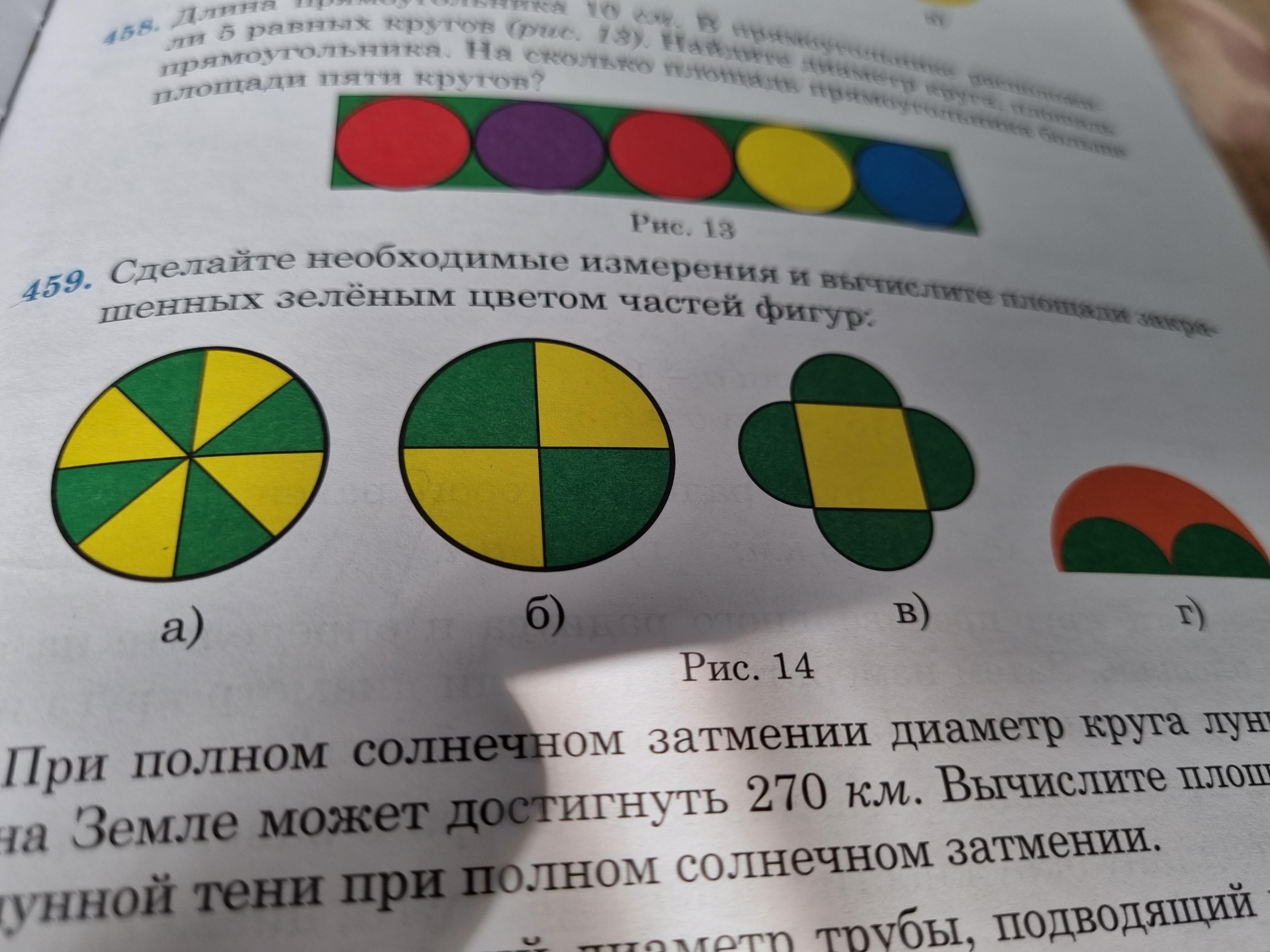 R=D:2(измеряешь диаметр D и делишь на 2 ,получаешь радиус R и далее находишь S зелёных)