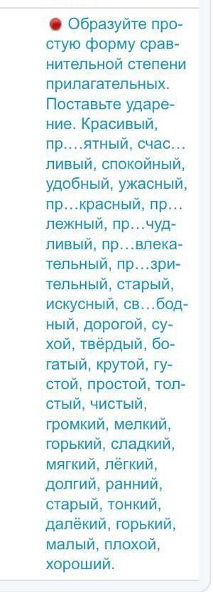 Красивее, приятнее, счастливее, спокойнее, удобнее, ужаснее, прекраснее, прилежнее, причудливее, привлекательнее, презрительнее, старше, искуснее, свободнее, дороже, суше, твёрже, богаче, круче, гуще, проще, толще, чище, громче, мельче, ___ , слаще, мягче, легче, дольше, раньше, старее, тоньше, дальше , горче, меньше, хуже, хорошее.